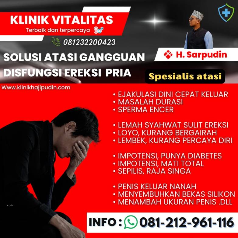 Terapi Pengobatan Tradisional Ejakulasi dini klinik alat vital yang kami dirikan sejak tahun 2000 bersama H. SARPUDIN merupakan pengobatan terapi alat vital asli dari Banten dan pengobatan alternatif terbaik di wilayah asalnya yang turun temurun di turunkan oleh keluarga. Metode yang kami terapkan dalam pengobatan alat vital kami ya itu dengan cara terapi pijat dan ramuan khas dan di sempurna kan dengan doa atau mantra di jamin 100% alami tanpa efek samping, tanpa obat kuat atau obat penambah stamina lain nya.jadi aman serta alami untuk diterapkan kepada anda, dan semua pasien kami terbukti puas dengan klinik pengobatan alat vital kami.Layanan Klinik Pengobatan Ejakulasi dini & Vitalitas